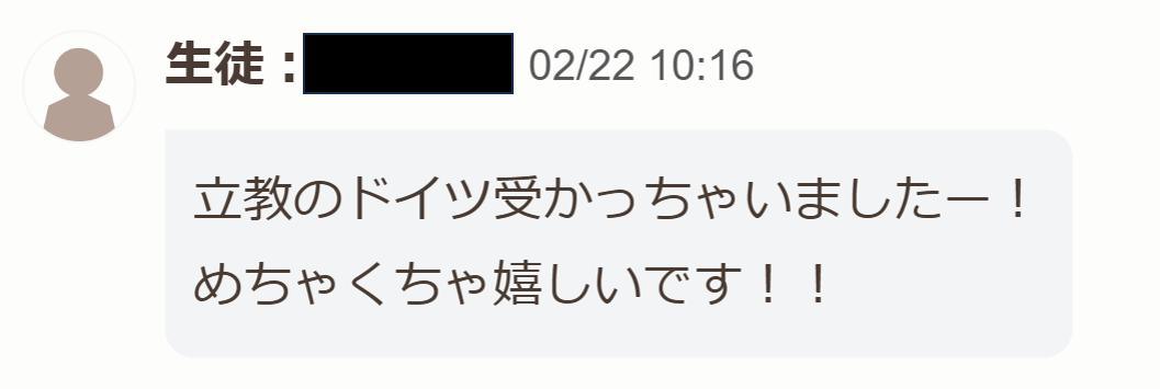 ③Hさん)10ヶ月通して、本当に頑張ることができて自信になりました。Rテストが授業の中にあって定着できているのかを確認できるのがありがたかったです。英検で思うようにスコアが取れない場合でも、あきらめずに頑張り続ければ、立教大学に合格できる可能性もあるので、最後まで頑張ってください!