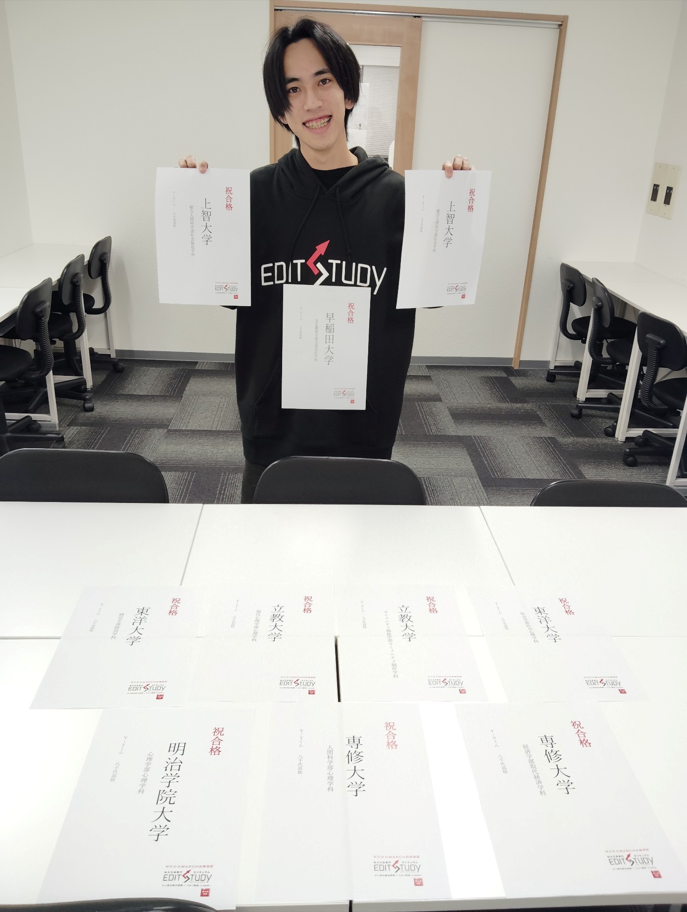 Yくん)そうですね。自分の苦手と得意を把握して戦略をSS(先生)と一緒に考えるってことですね。EDIT STUDYなら柔軟に対応してくれるので。僕の場合は間違いなく英検のスコアで早い段階で準一級のそれなりのスコアとって早稲田も上智も結局そこに助けられているので、後は日本史とか比較的得意な科目を武器にするって感じですね!