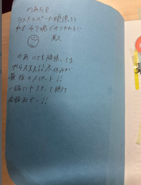 ただ、7月までは部活中心でこれって早くて、塾に着くのも7時、8時前とかみたいな感じだけど、授業に遅れながらもそれを追いつくためにちゃんと毎日のように来てくれてはいたじゃない。 やっぱあの時間がなかったら受かってないよね。