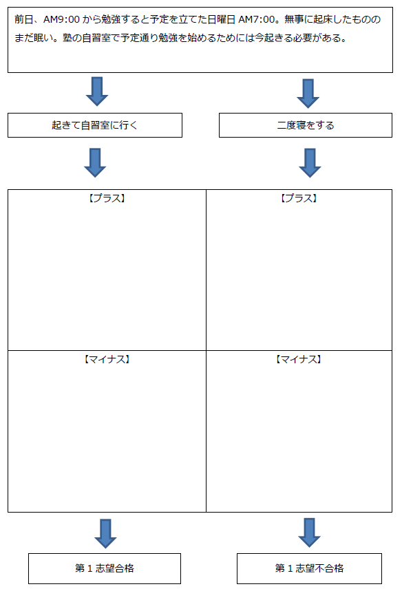 Sくん)なんか、マスが4つに分かれていて、今自習室に行って勉強することと、あるいは勉強しないことのプラス面・マイナス面を考える表はよく覚えています。