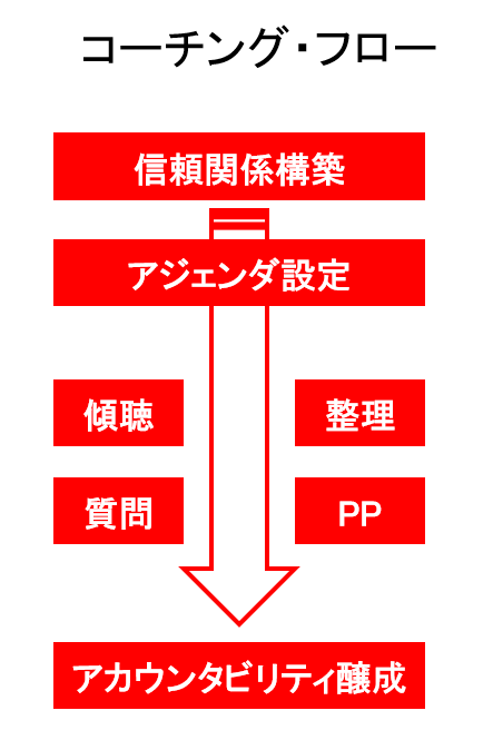 では2つ目に『信頼関係構築』に関してみていきましょう。コーチングのフローにおいて信頼関係構築は切っても切り離せないものです。まずは下記コーチング・フローを確認してください。