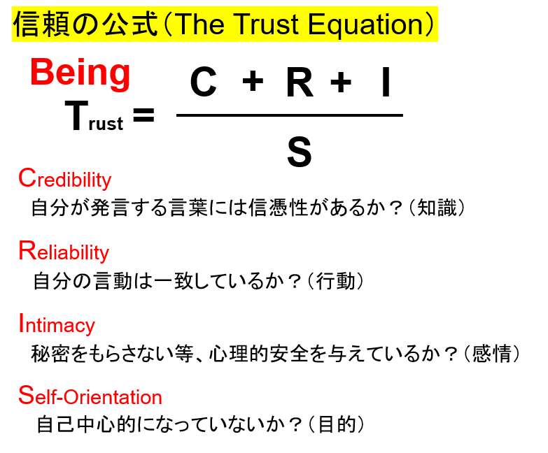 ※下記は信頼の公式になります。ご自身の信頼関係構築の過去のプロセスを振り返ってみましょう。