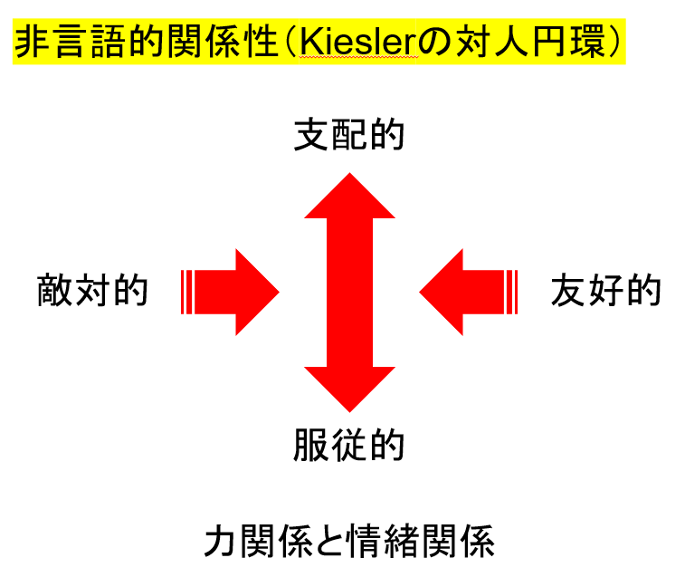 また信頼関係構築において、非言語的関係性(Kieslerの対人円環)も知っておくとよいでしょう。下記の図の通り、人間関係においては力関係と情緒関係が存在します。自分自身が相手に対して敵対的な態度で接した場合、相手も自身に対して敵対的に接してきますよね?
