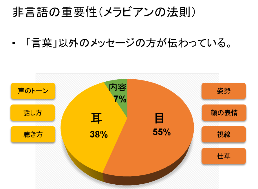 また信頼関係構築において非言語の重要性(メラビアンの法則)も抑えておきましょう。