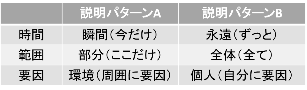 例えば、悪いことがあった時に楽観性の高い生徒は説明パターンAで『このテストの結果は今回だけでしょ(時間:瞬間)』『このテストの結果は今回の範囲だけ(部分:ここだけ)』などと捉えることができます。逆に楽観性の低い生徒は『このテストの結果はずっと続いちゃうな(時間:永遠)』『このテストの結果は英語だけじゃなくて国語もきっとダメだな(範囲:全体)』となり、出来事が同じでも捉え方が変わり、捉え方が変わるとその後の行動も変わってしまいます。