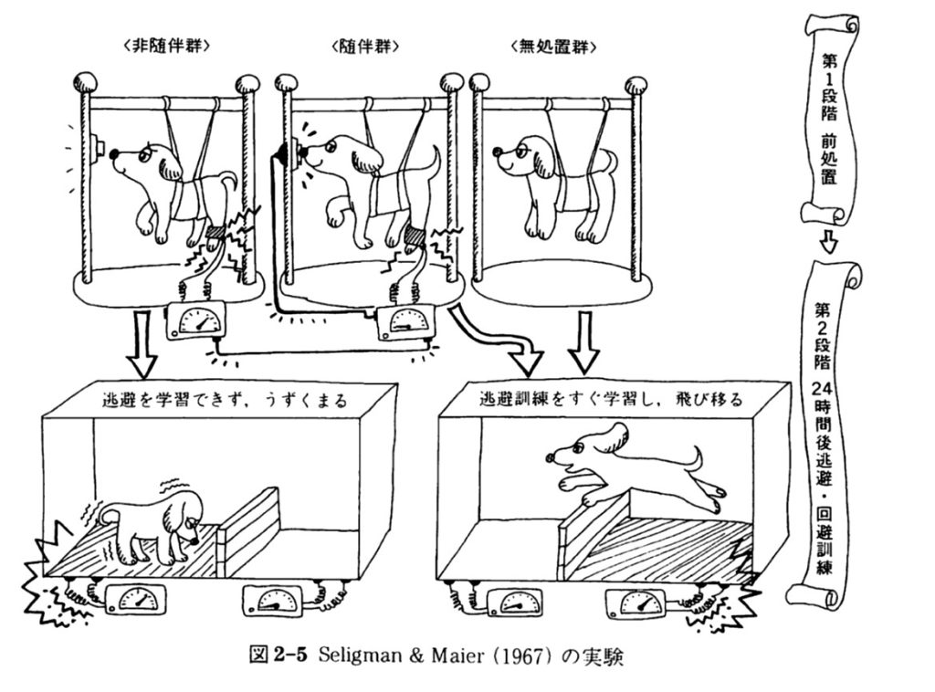 ある実験でイヌを 3 グループに分け、グループ1 と2のイヌ(上段左・真ん中)の足に電気ショックを与えました。グループ2(真ん中)のイヌは鼻でスイッチを押せば電気ショックが止まる仕組みになっています。(つまり、「自分が何かをすれば、状況や結果は変えられる」ことを学ぶ)